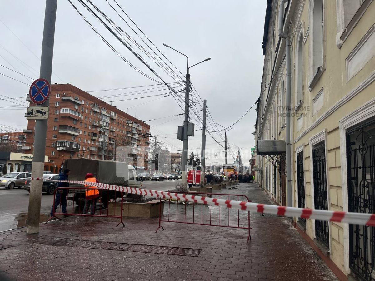 Фасад здания, можно сказать, уцелел. Однако для безопасности туляков тротуар рядом с домом огорожден, а проход запрещен. Серьезные разрушения имеет крыша, которая рухнула вечером прошлого дня. Рухнул прошлым вечером и купол. На его месте видны следы копоти. Окна частично выбиты. Их убирали для проникновения спасатели. Где-то они отсутствуют полностью, а где-то еще видны битые стекла.