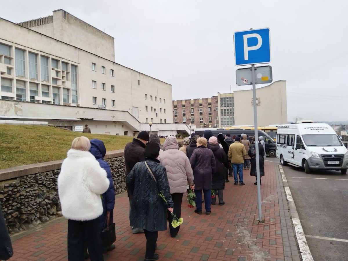 Прощание почему-то проходило в малом зале драмтеатра. Помещение смогло вместить, наверное, только четвертую часть от желающих попрощаться. Близкие, коллеги, друзья и знакомые бывшего мэра, которые не пришли к началу, заполнили собой все фойе, а также территорию от входа до площади Ленина.