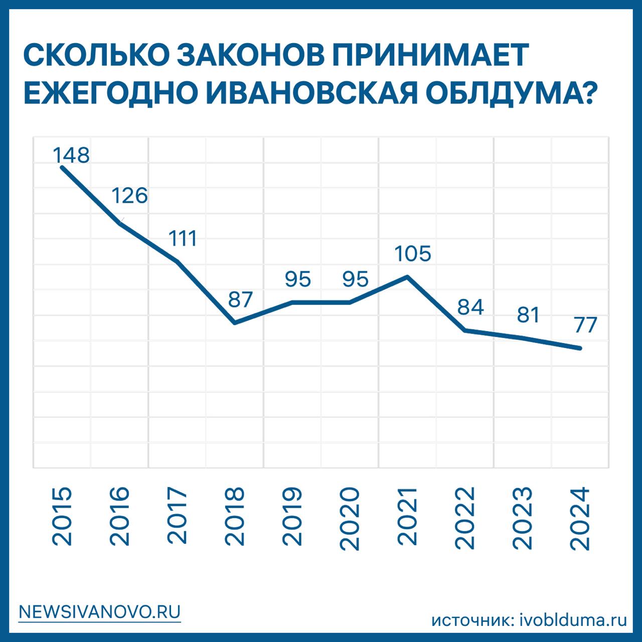 За последние десять лет законодательная активность депутатов Ивановской областной Думы сократилась почти вдвое. Если в 2015 году региональный парламент принял 148 законов, то в 2024 году — уже 77. Разница составила 48%.