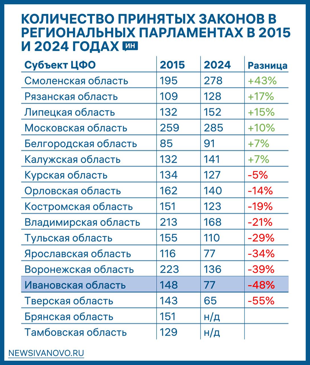 Согласно анализу данных по регионам Центрального федерального округа, Ивановская область находится практически в конце списка по количеству принятых законов. Лидерами по законодательной активности стали Смоленская, Рязанская и Липецкая области.