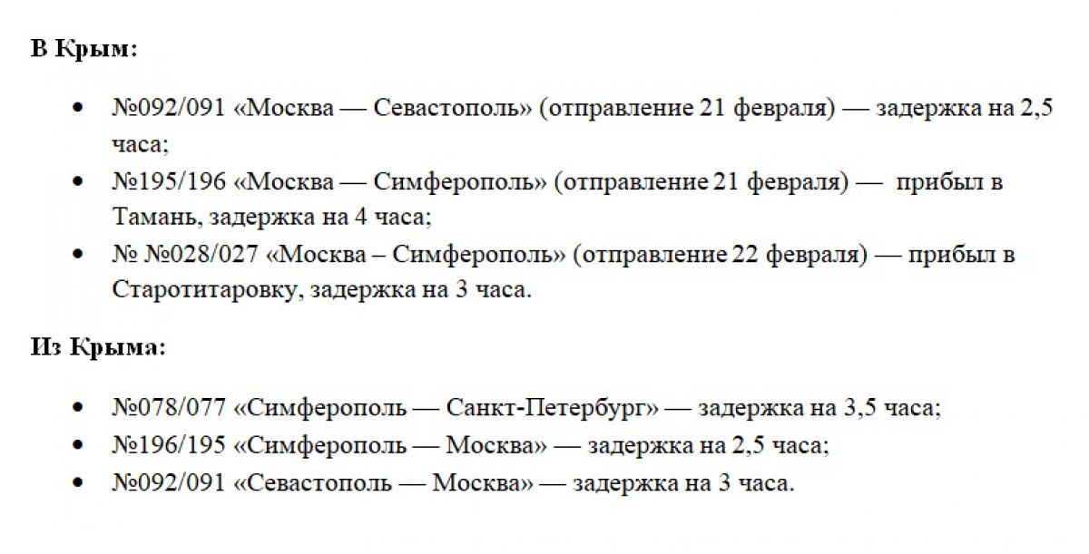 По состоянию на утро несколько составов, следующих на полуостров и обратно, либо серьезно задерживаются, либо вовсе стоят на станциях. Список задерживающихся поездов можно увидеть ниже: